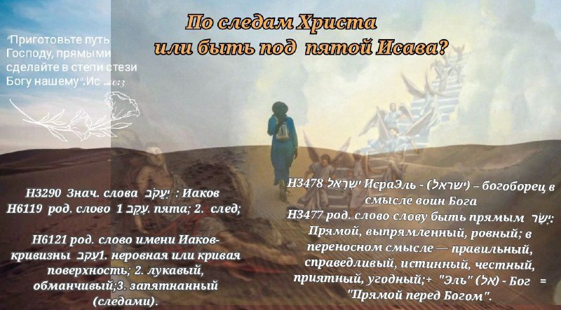 Исав был первенцем, старшим сыном - ему принадлежали особые права и преимущества первородства, и Иакову оставалось одно следовать за пятой, по следам Исава . Как же из Иакова( из этого хитрого, лукавого и коварного ) получился Израиль ( прямое, правильное, исправленное) ….Для этого Иакову надо было пойти Божьим Путем…….